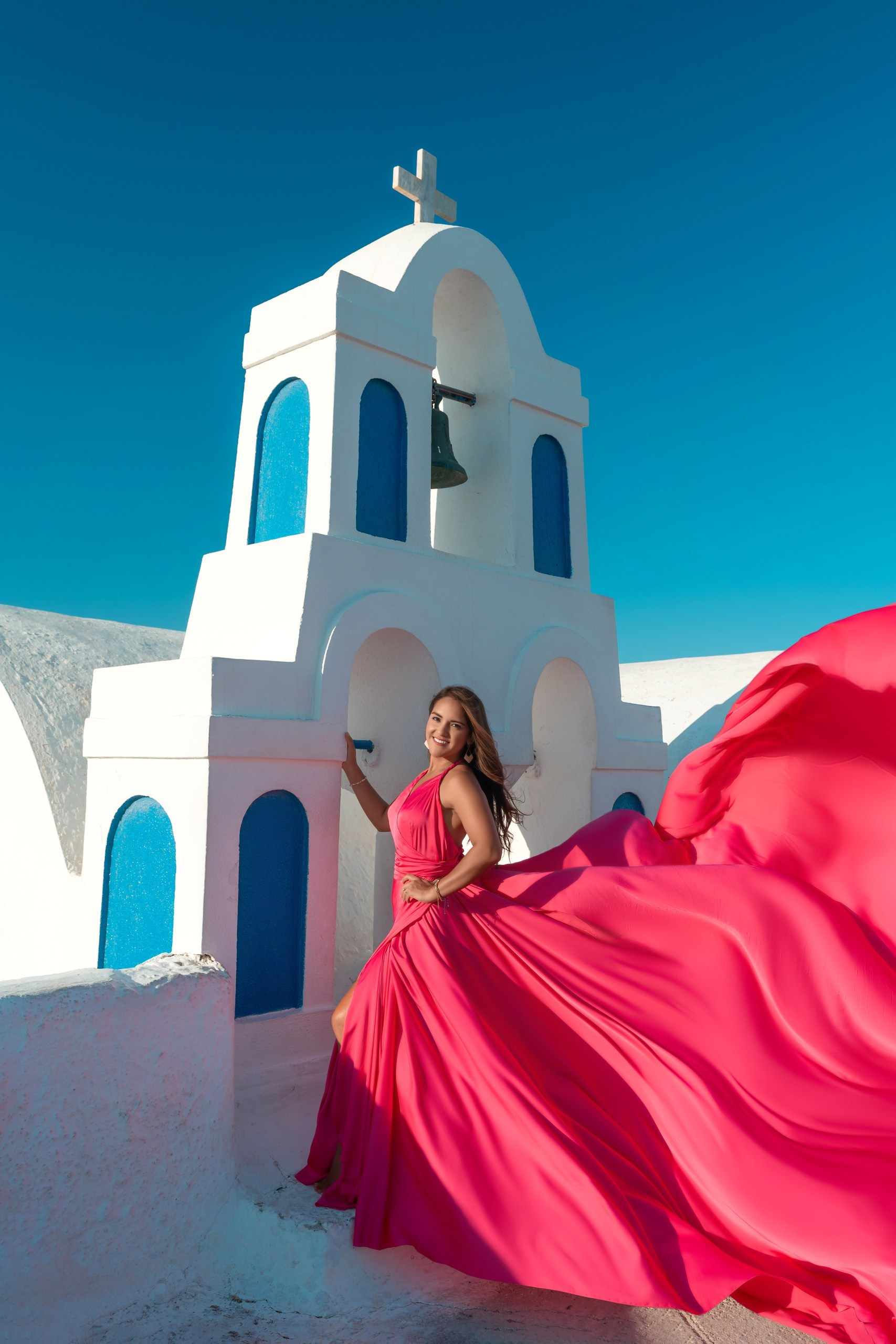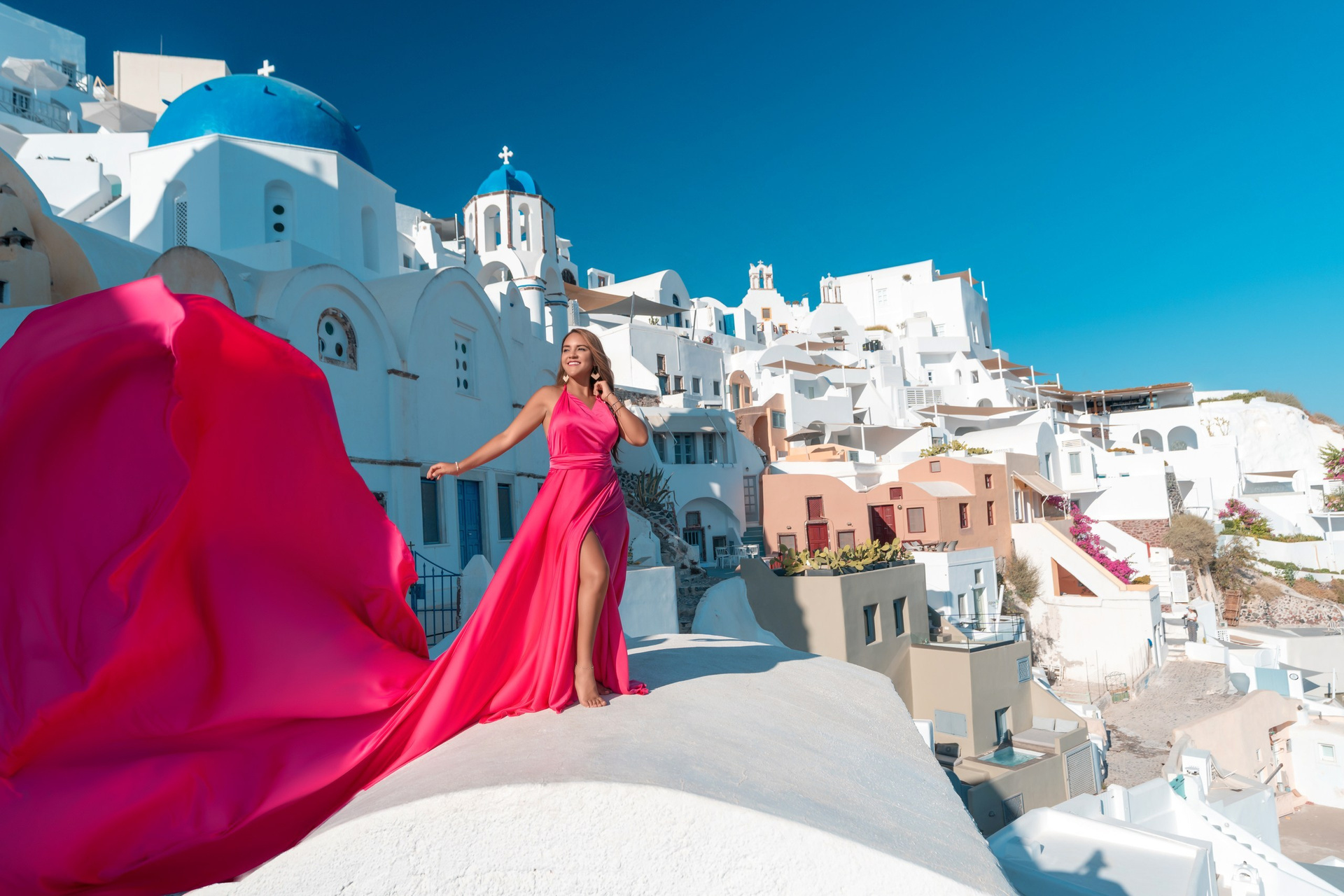 Santorini Flying Dress Photoshoot 2025 sunset time in Oia