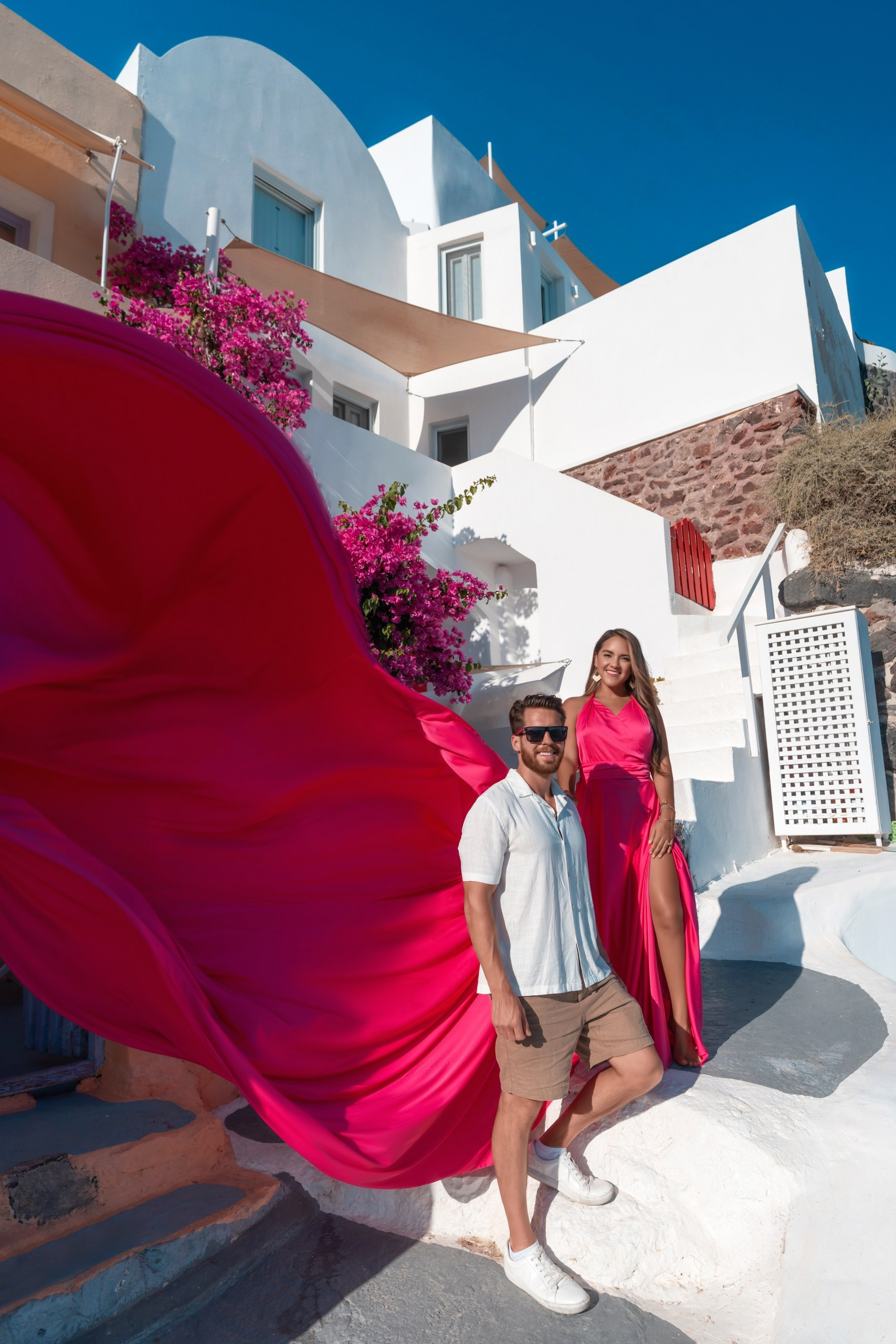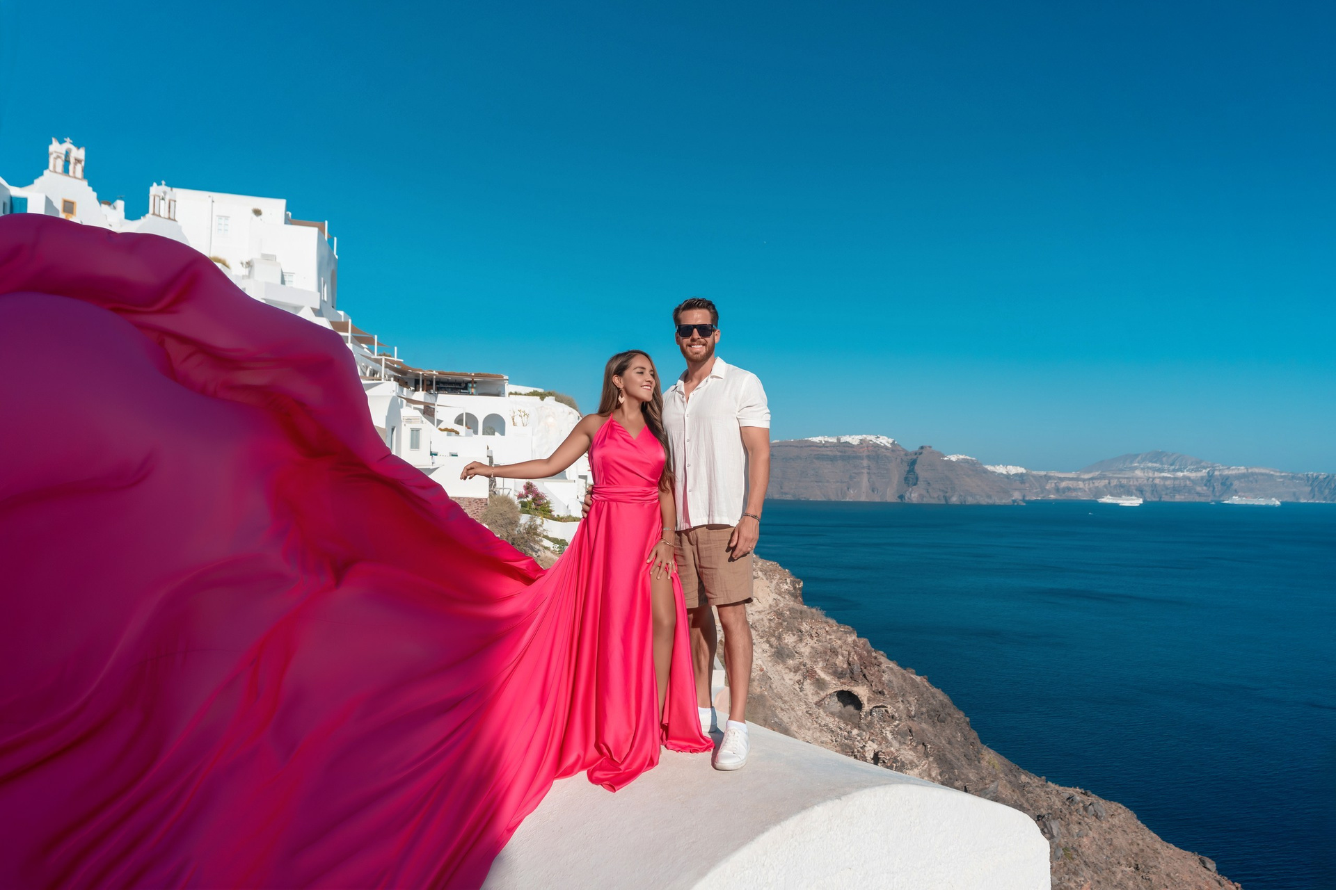 Santorini’s Magic in Motion: Flying Dress Photoshoot with a Lovely Couple from India