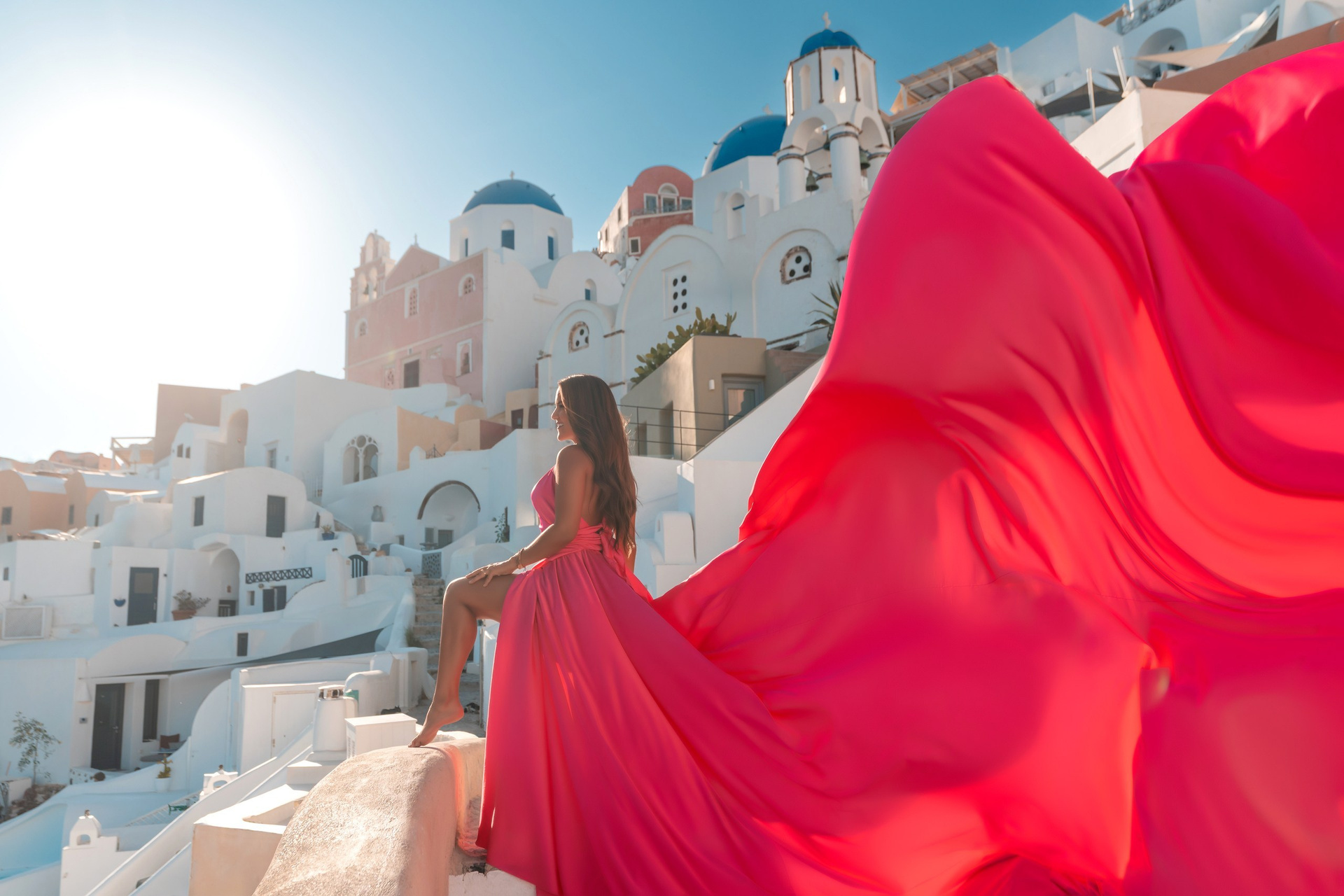 Ethereal Romance: A Breathtaking Flying Dress Photoshoot in Santorini