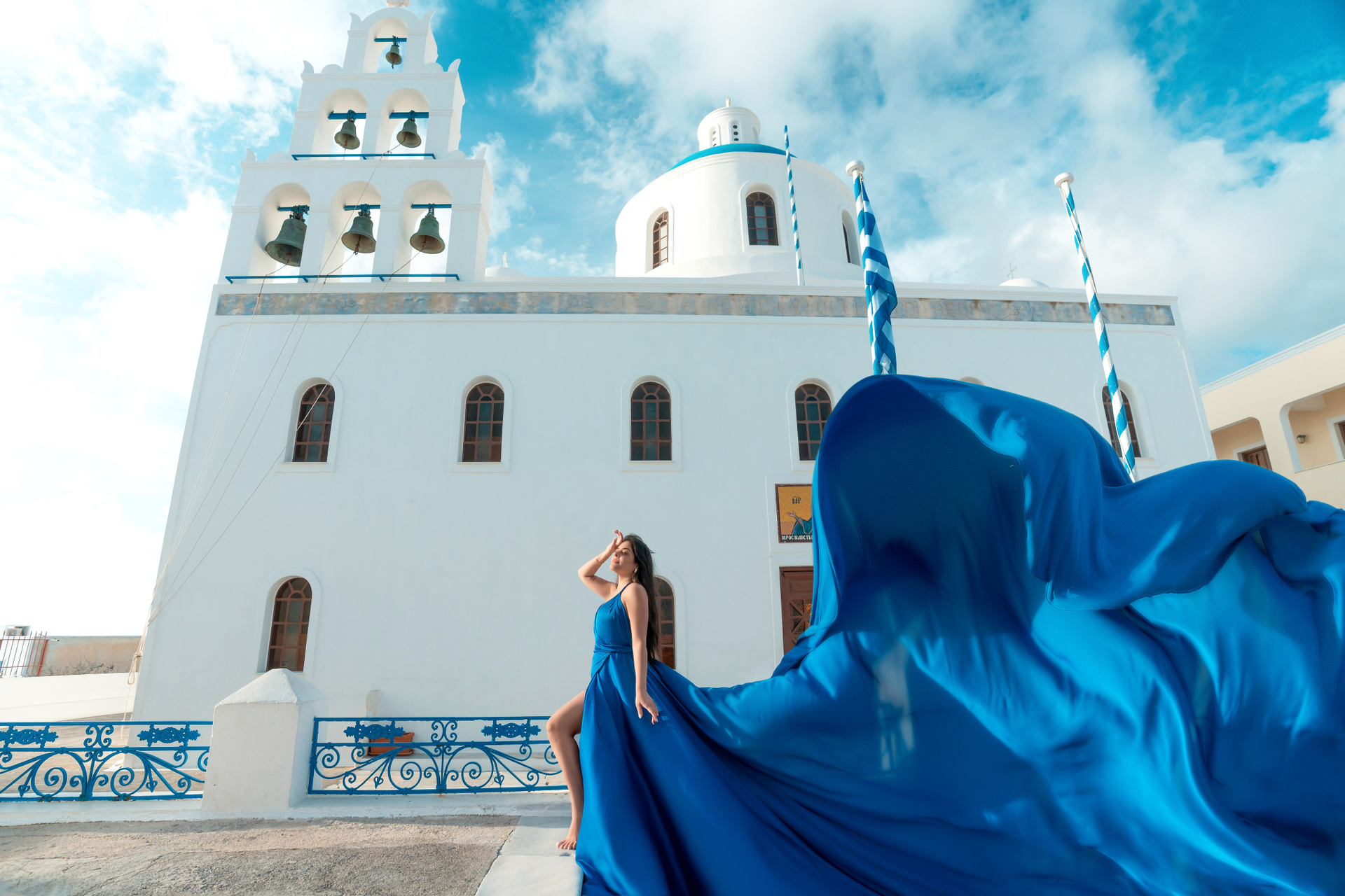 Séance photo en mars Robe volante bleu roi Santorin