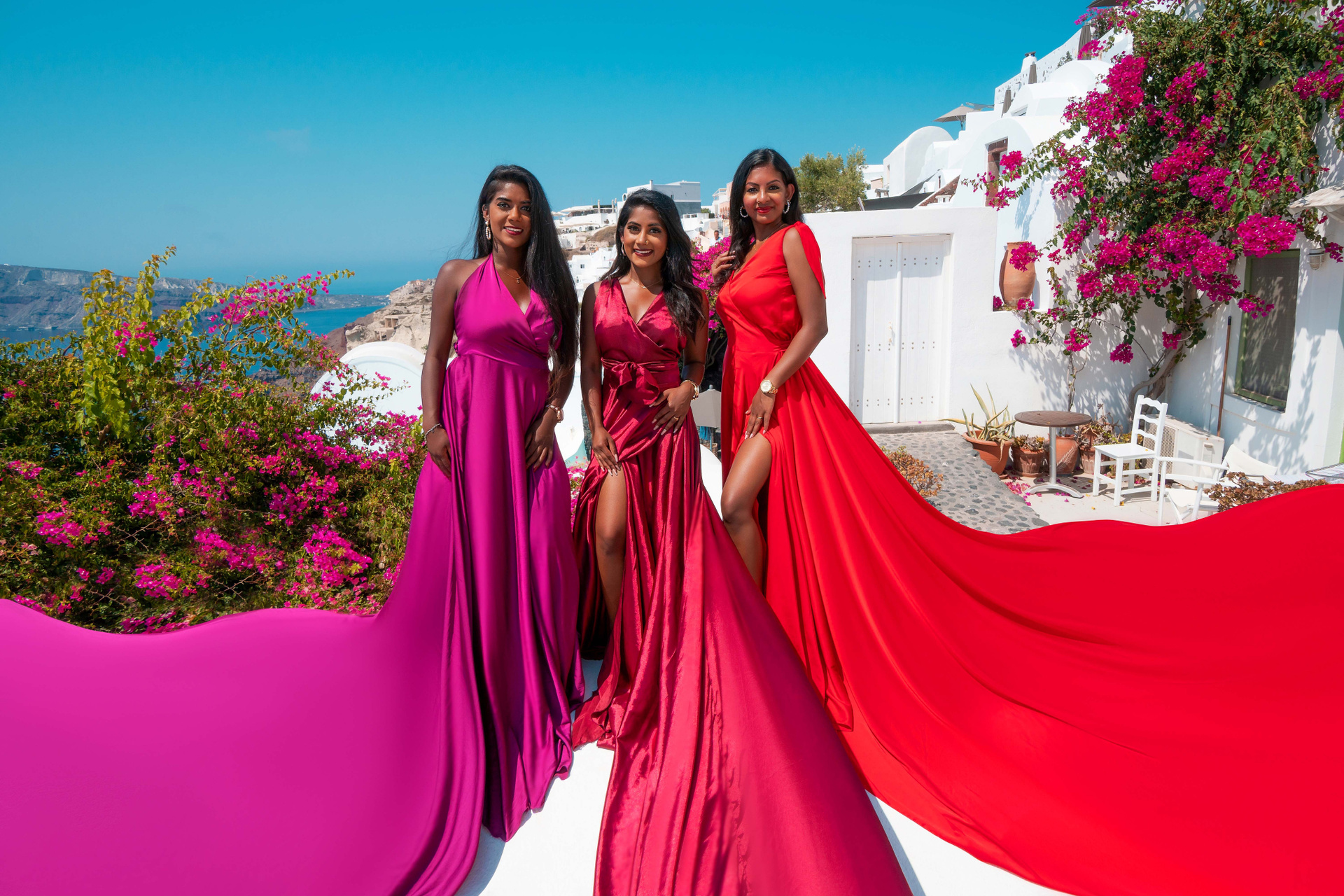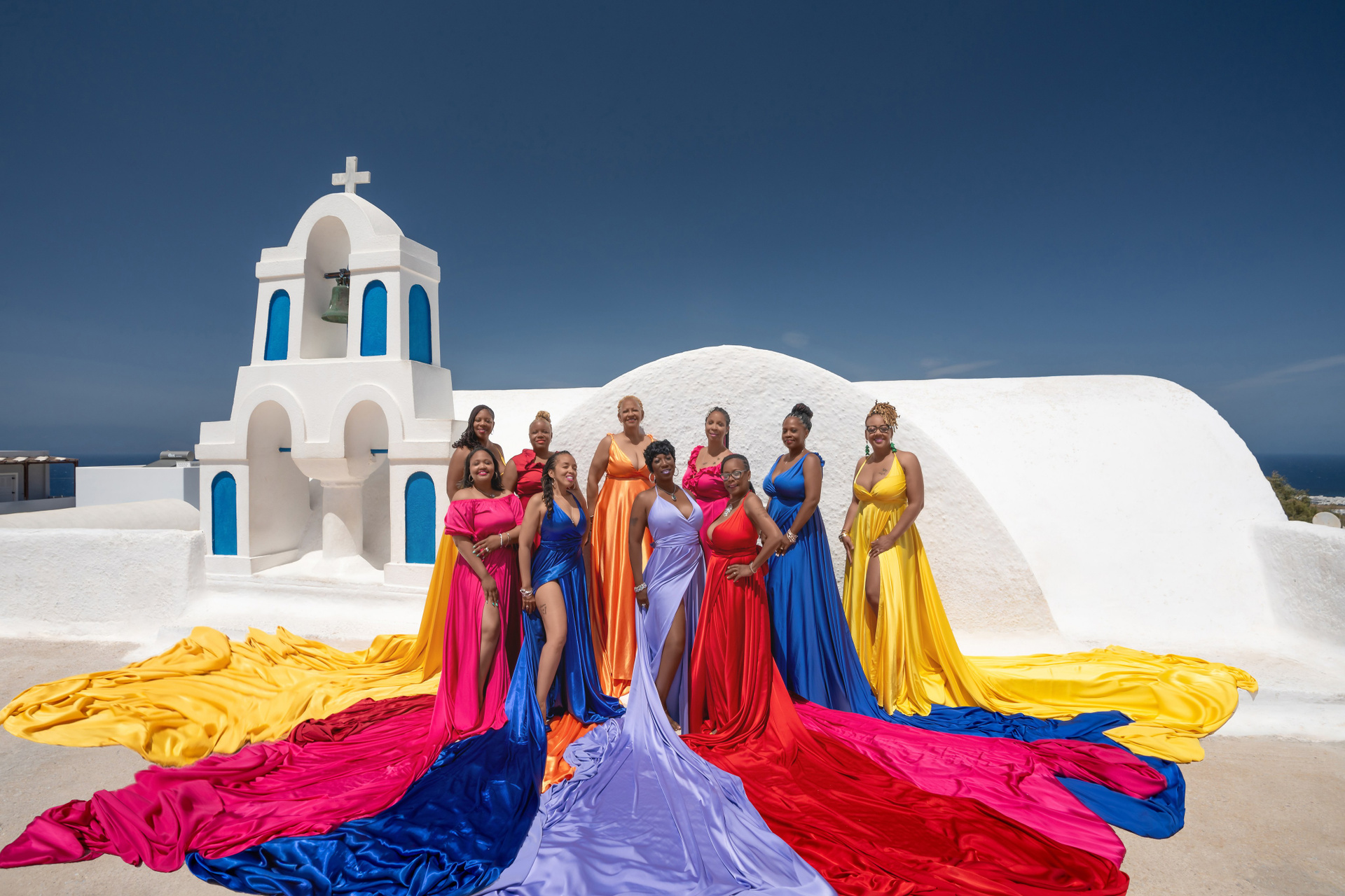 Ebony group photoshoot in flying dress in Oia