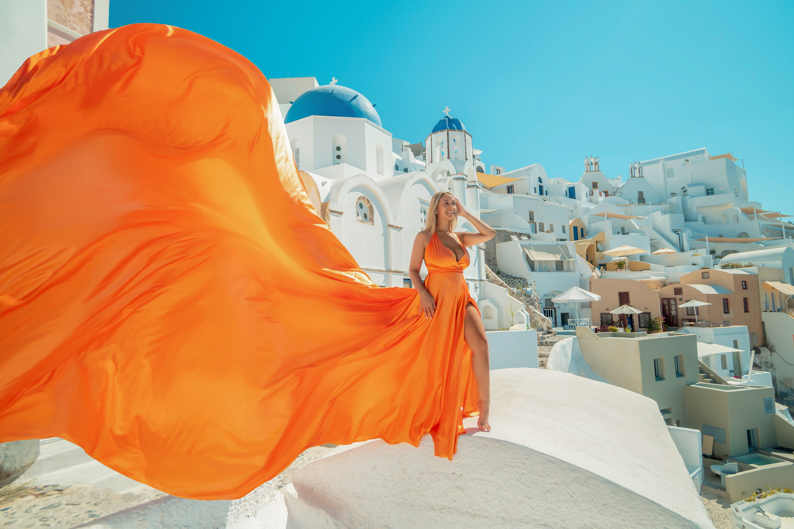Overall, the Flying Dress in Orange satin with a bare back is an excellent choice for anyone looking to create a bold, daring, and unforgettable photoshoot. So why wait? Start planning your shoot today and let this dress take center stage!