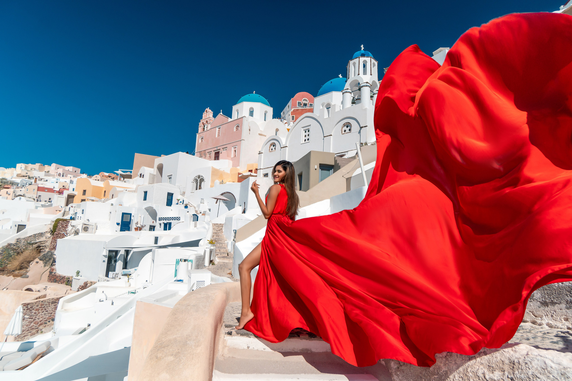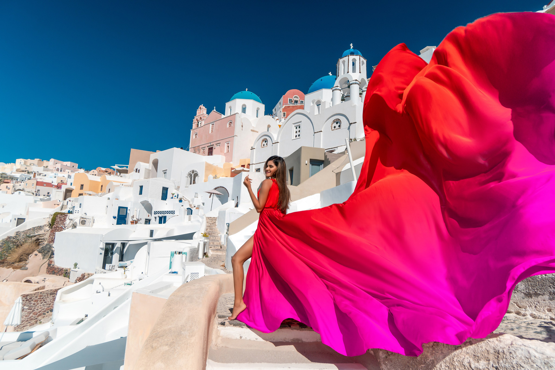 The answer is simple — Santorini is already one of the world’s most romantic and picturesque destinations, but a flying dress adds movement, elegance, and drama to every shot. The sweeping fabric catches the wind, creating a visual story of freedom, passion, and timeless beauty.
